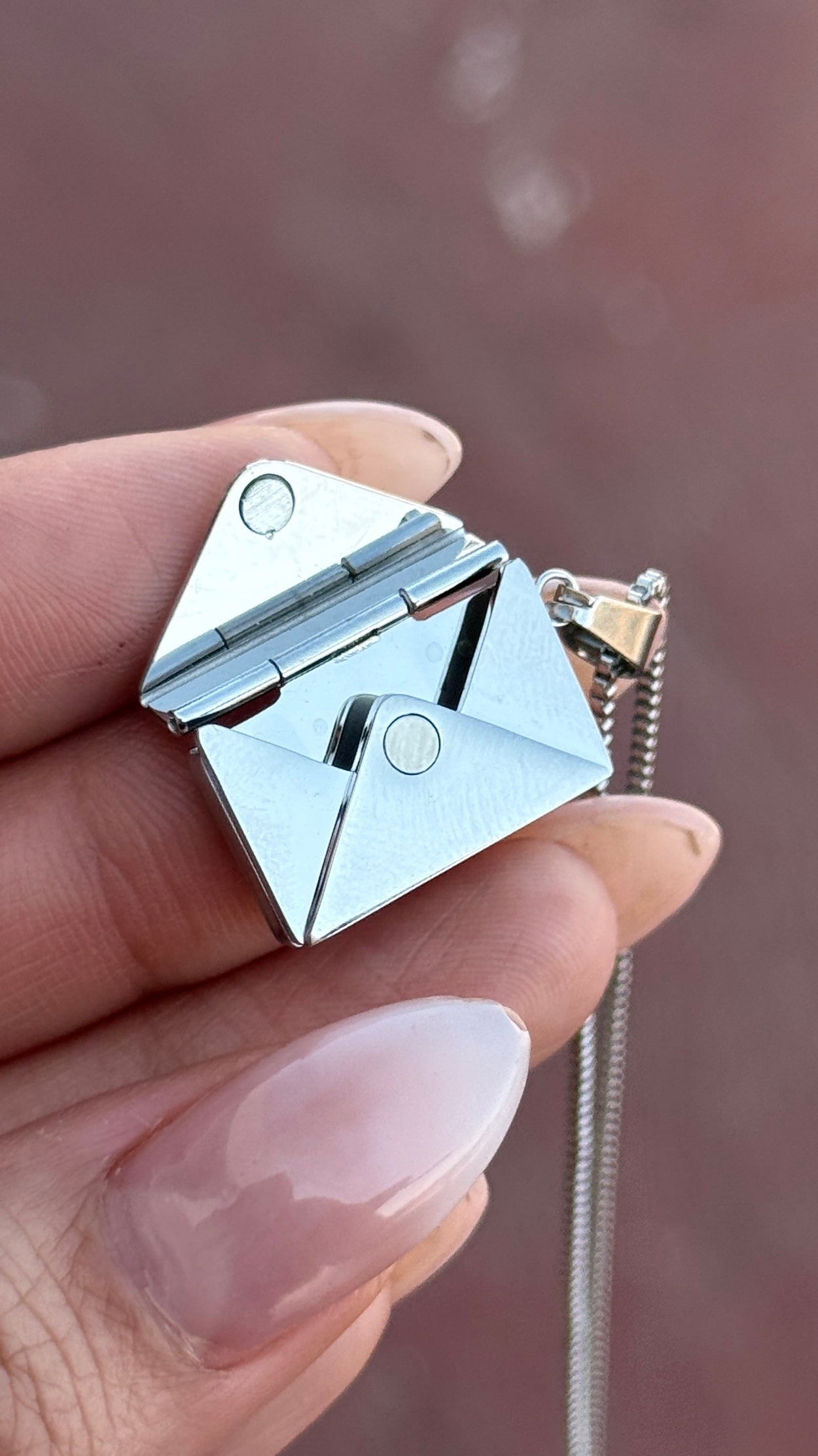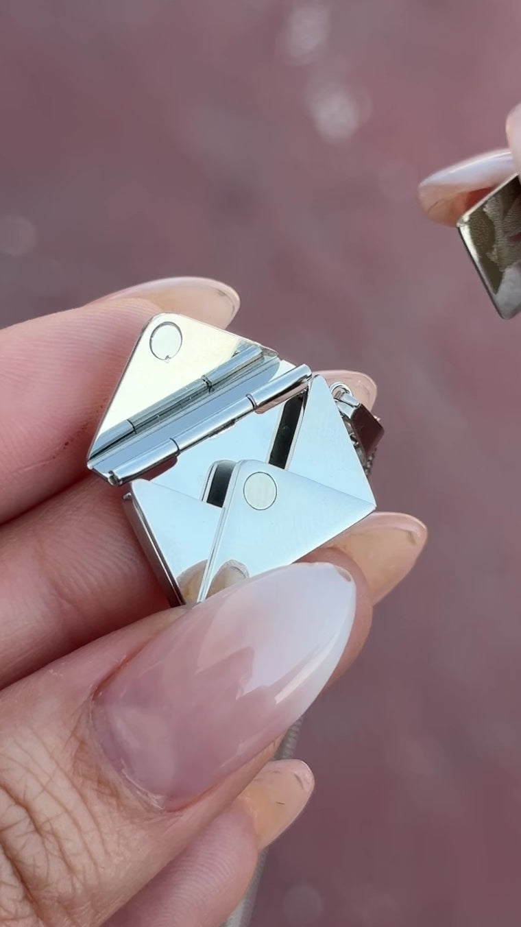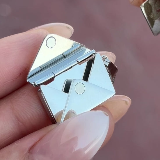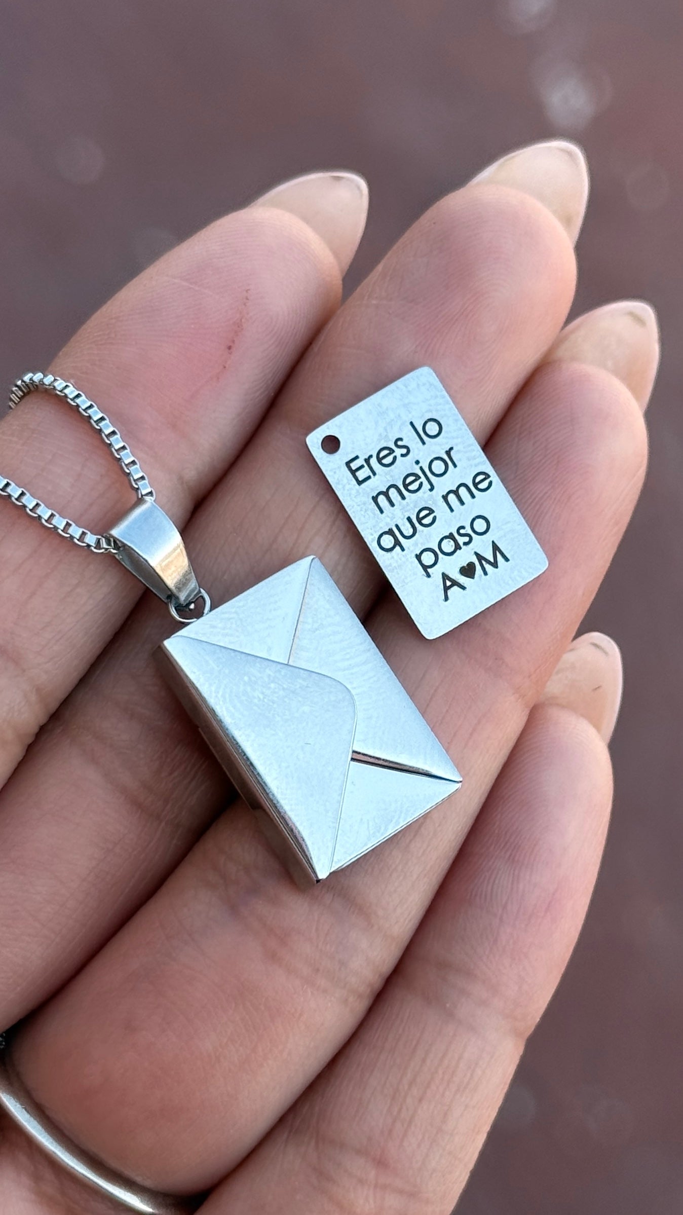 Este collar con dije de relicario en forma de sobre te permite conservar tus recuerdos más preciados. Puedes elegir una foto para colocar en el interior y personalizar el texto grabado, haciendo de esta pieza un símbolo único y especial para conmemorar momentos inolvidables. Perfecto para llevar cerca del corazón o regalar a alguien querido.