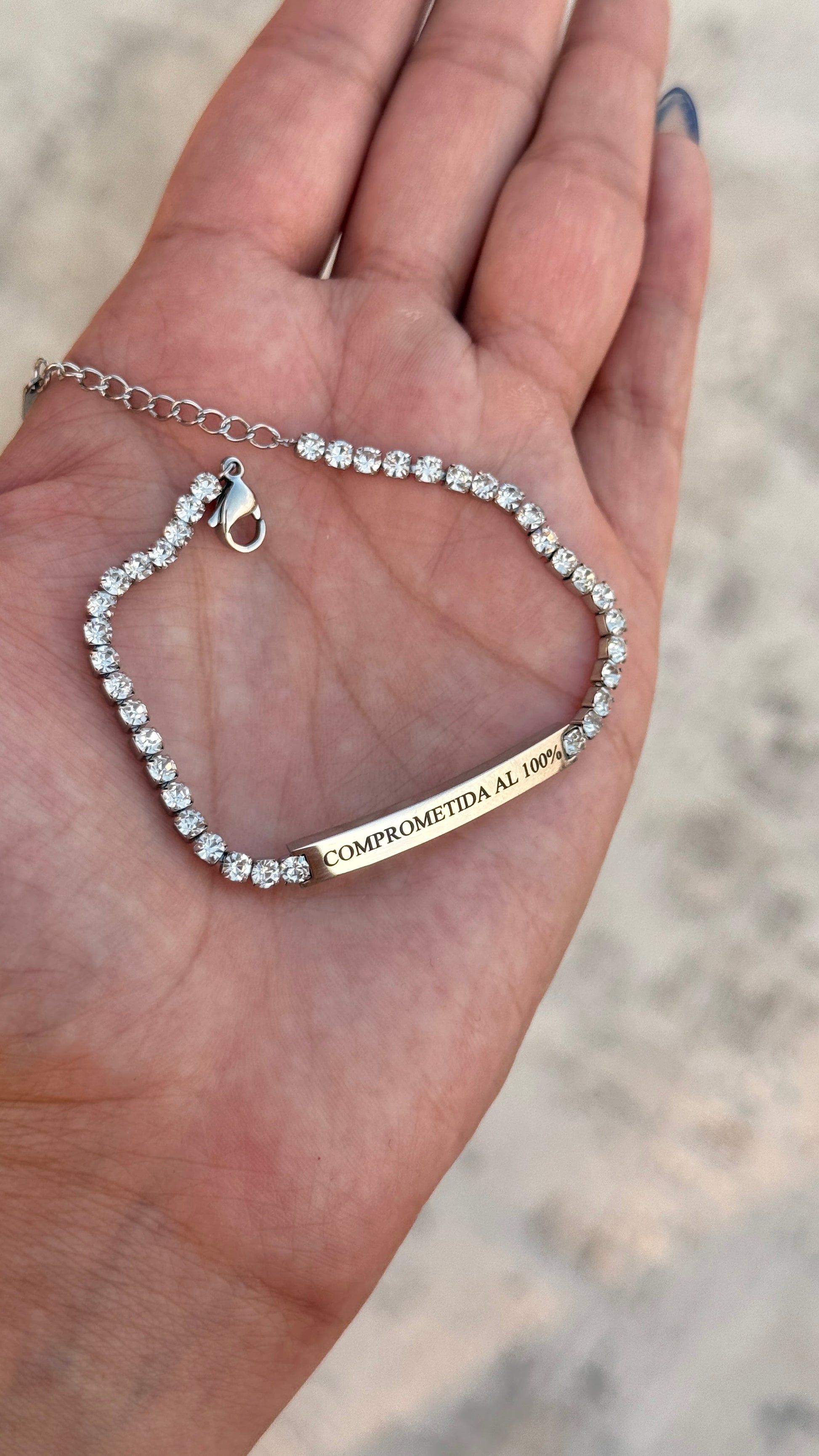 ¡Personaliza tu estilo con nuestra pulsera de tenis hecha de acero inoxidable! Con una placa personalizada con tu texto favorito, esta pulsera es ideal para llevar un mensaje motivador o de amor contigo en todo momento. ¡Resistente y elegante, será tu accesorio perfecto para lucir en cualquier ocasión!