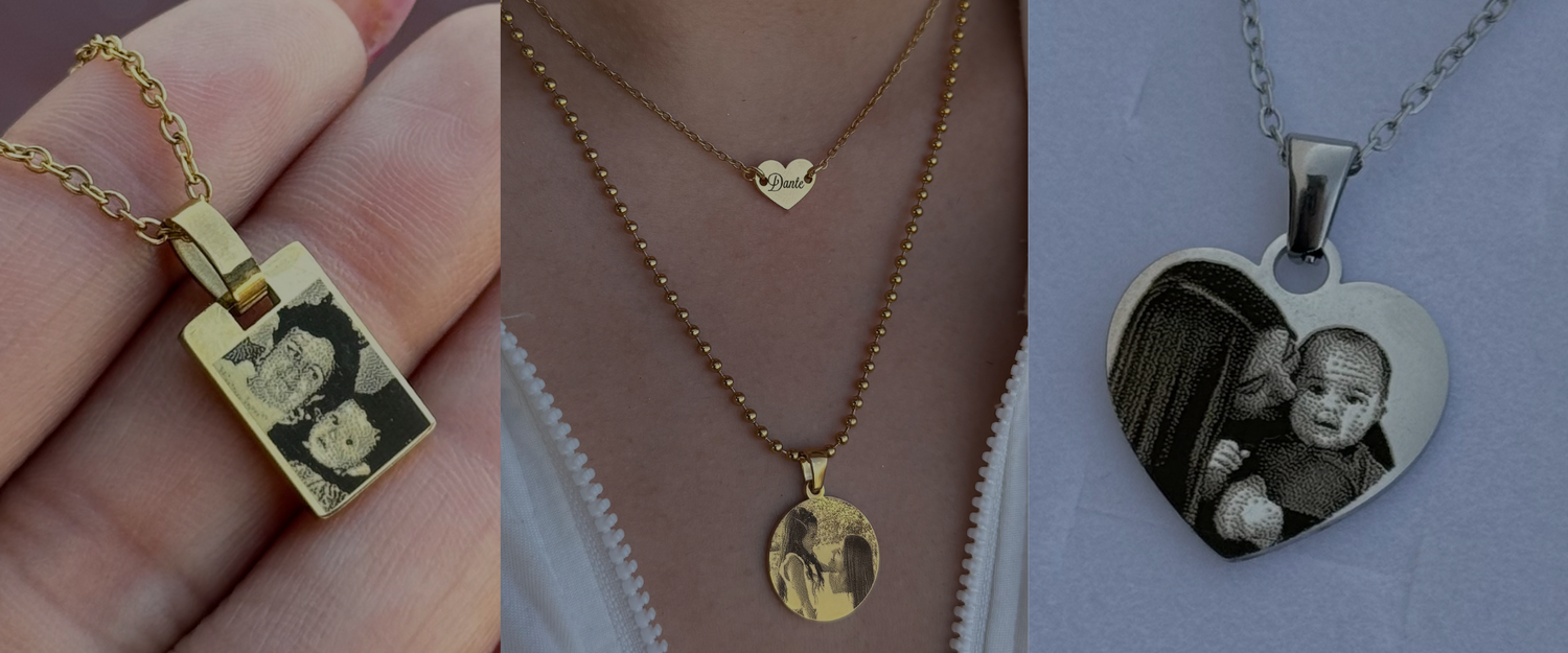 Ofrecemos joyería personalizada en acero inoxidable y oro de 10k, con opciones para añadir frases, fechas, imágenes o dibujos que le den a cada pieza un toque único.