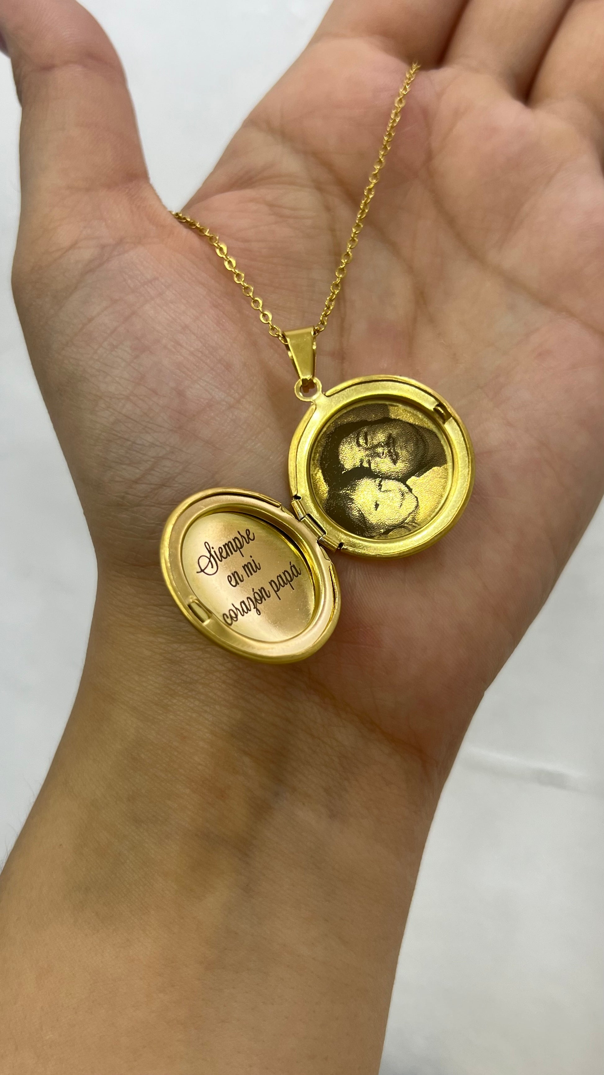 • Collar con dije de relicario en forma de Circulo con fotografía grabada a láser