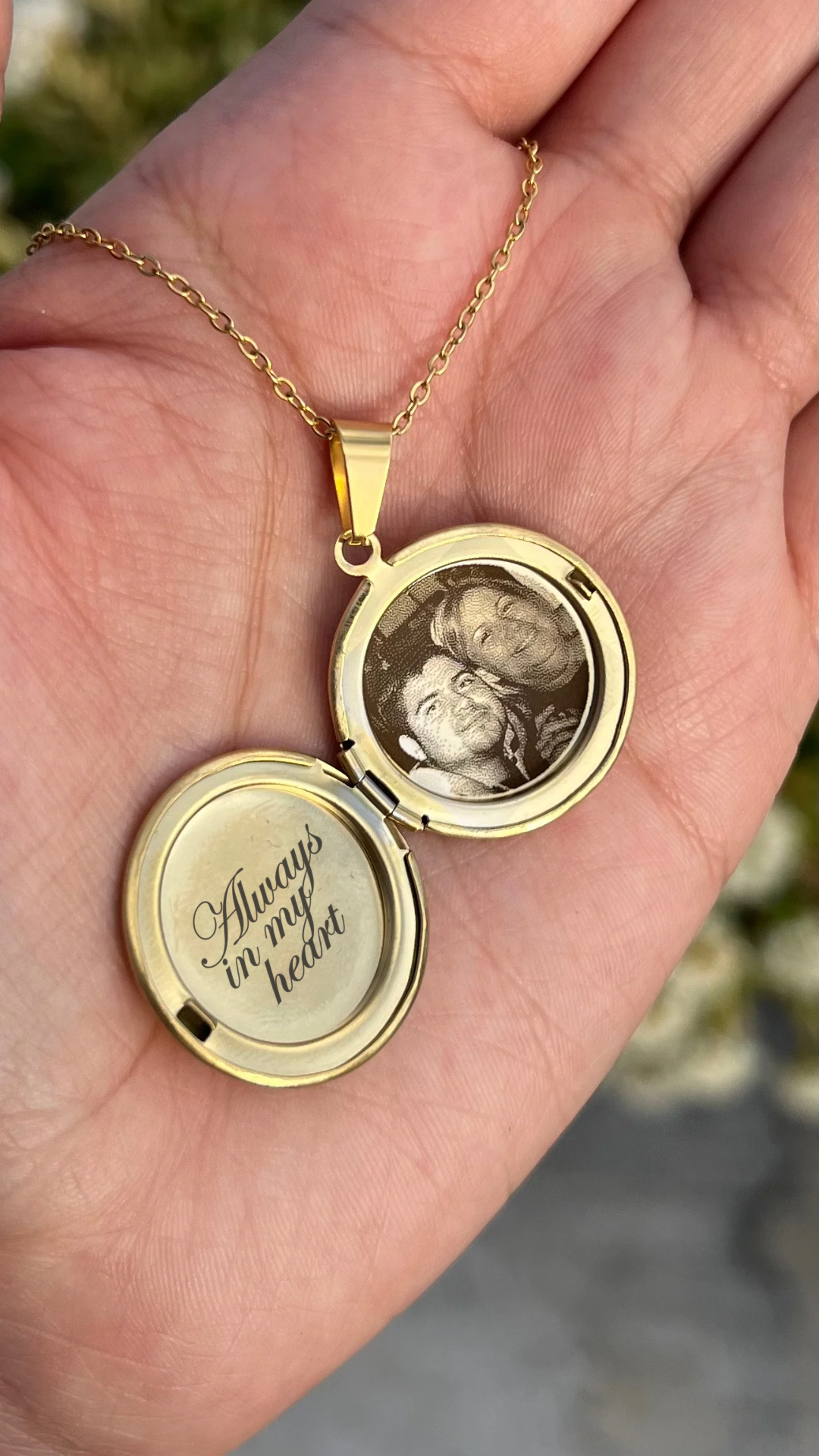 Este collar relicario de círculo en acero inoxidable te permite conservar tus recuerdos más preciados cerca del corazón. Puedes elegir una o dos fotos para grabar en el interior y añadir un texto personalizado, creando un homenaje único y significativo. Perfecto para mantener vivos momentos especiales y personas queridas con un diseño elegante y duradero.